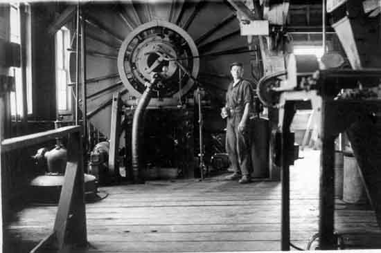 Machinery from Island Mountain mill. Described as a Dorco Filter, 10' diameter by 5' wide, Internal Drum. Operated by Frank Campbell, an employee of the Island Mountain Mill. One photograph : b&w ; 2.5 x 3.5 inches. Collection of photographs donated by Dave Johnson (wp-200-307) and date between 1930 and 1941.