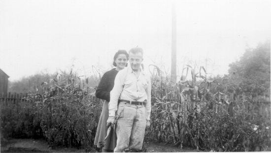 "Harry And Hazel Sturenburg" written in ink on the back of the photograph. Standing together in front of corn stalks. group of five men seated on the stairs of the Lode Theatre. The names "Conrad Lein, Ernie Taylor, Olie Mage, McLeod, Ernest Bell" are printed in ink on the back. 1 photograph : b&w ; 4.3 x 2.5 inches. Collection of photographs and postcards donated by Ernest Bell, wp00308-342. Photographer unknown, photographs taken in Wells and surrounding area.