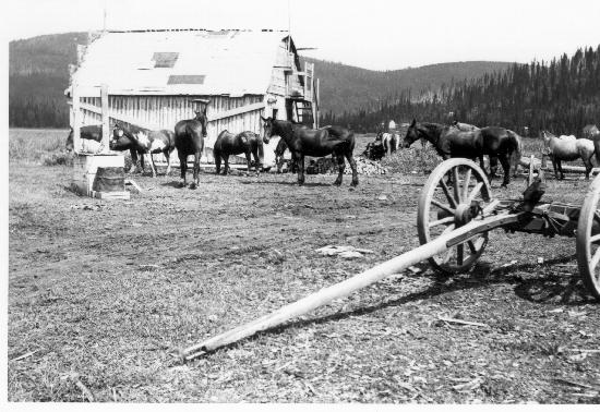 George Riviere's pack horses and barn building. Located in south Wells beside the K.H. Sing Store.1 photograph : b&w ; 11.5 x 8 cm. Collection consists of photographs donated by Colin MacDonald (wp00562-566,586-591,618,625,631,647,655,660,663,664,680,696-701) photographer unknown. Photographs are predominately in the Wells area.