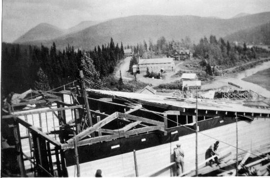 Island Mountain Mine buildings under construction in the early 1930's, perhaps 1932 or 1933. 1 photograph : b&w ; 6.5 x 11 cm. Collection consists of photographs donated by Eric Johnson (wp00614,615,652,657,738,900-902,909,967-969) photographer unknown. Photographs taken between 1930-1941, predominately in the 1930s.