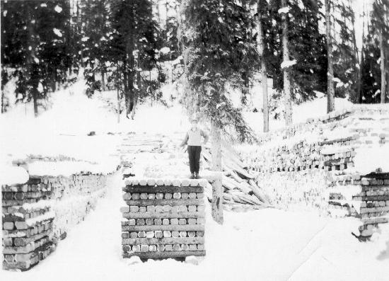 Unidentified man standing on cords of wood. One photograph : b&w ; 3.5 x 4.5 inches. Original. From collection Wp-99-144.