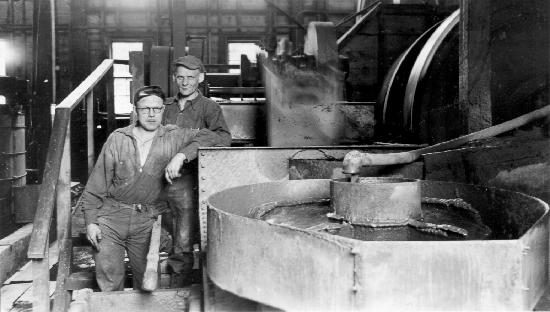 Written on the back of the photograph "Frank Campbell (L) and Dave Ogden (R) in Island Mountain Mill. 1936. Dorr Model "F" Multizone Classifier and Marcy No.64.5 ball mill." One photograph : b&w ; 3.5 x 5.75 inches. Collection of photographs donated by Dave Johnson (wp-200-307). Photographs date between 1930 and 1941.