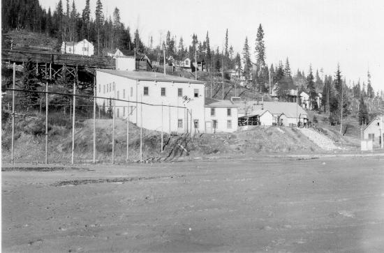 Mill at Island Mountian mine and Wells Townsite in the Background. One photograph : b&w ; 2.5 x 3.5 inches. Collection of photographs donated by Dave Johnson (wp-200-307) and date between 1930 and 1941.