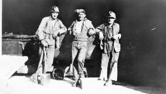 Employees of the Cariboo Gold Quartz Mine, identified from left to right are J.Leonard, C.Keith, and A.Webster. Written on the back of the photograph " Three of the best at the Quartz. L-R J.Leonard, C.Keith, A. Webster July 1933". One photograph : b&w ; 4.5 x 2.25 inches. Collection of photographs donated by Dave Johnson (wp-200-307) and date between 1930 and 1941