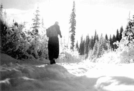 "A. Grady" cross country skiing, as identified on the back of the photograph. 1 photograph : b&w ; 9 x 6.5 cm. Collection of photographs and postcards donated by Ernest Bell, wp00308-342. Photographer unknown, photographs taken in Wells and surrounding area.
