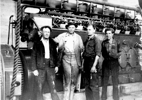 Men identified from left to right are Colin McDougall, Pont Johnson, Bob Newman, and Bob Morgan. The Cariboo Gold Quartz Mine Powerhouse 1933-1934. One photograph : copy : b&w ; 10 x 8 inches.