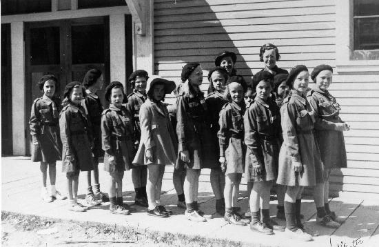 Brownies identified from left to right starting at the back of the lineup are: Phyllis Galder at the back, two unknown girls paired, Marina Andrechuck or Betty McDougall paired with Elaine Allen, two sets of unknown girls, Mary Pike paired with an unknown girl, Kathy Andreychuck paired with an unknown girl, and Hanna Randall and Mable Kempster paired at the front. Shown standing on the sidewalk in front of the Wells Community Hall.One photograph : b&w ; 25 x 20 cm.