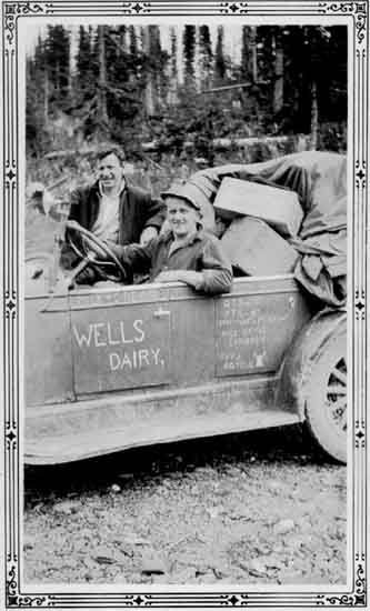 Written on the back of the photograph "Paul Neilson at wheel and Fred Jensen. I've heard that Paul worked for a Mr.McConnel Wells Hotel. 1935-1936" Both men are in the Wells Dairy truck. 1 photograph : copy : b&w ; 10 x 8 inches .