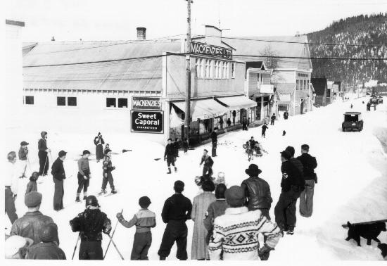 Dog Sled races on Saunders Ave. Buildings identified are MacKenzies Ltd, Buckley's Pharmacy, and the Wells Community Hall. 1 photograph : b&w ; 11.5 x 8 cm. Identical to photograph wp 00588. Collection consists of photographs donated by Colin MacDonald (wp00562-566,586-591,618,625,631,647,655,660,663,664,680,696-701) photographer unknown. Photographs are predominately in the Wells area.
