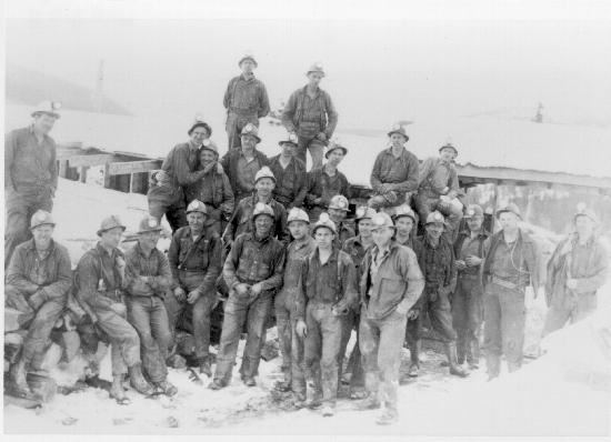 Cariboo Gold Quartz Mine crew, coming off shift. Photograph taken in 1936 or 1937. One photograph : b&w. Collection consists of photographs donated by Anne Sotvedt (wp644, 682, 694, 695) taken in the Wells area between the years 1935 and 1937, photographer unknown.