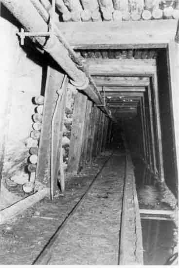Timber stope sill, cut and fill stope at the Cariboo Gold Quartz. 1 photograph : b&w ; 11.5 x 8 cm. Collection consists of photographs donated by Colin MacDonald (wp00562-566,586-591,618,625,631,647,655,660,663,664,680,696-701) photographer unknown. Photographs are predominately in the Wells area.