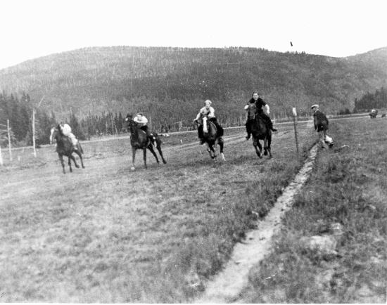 Horse race track on the meadow, Wells. 1 photograph : b&w ; 14 x 8 cm. Collection of photographs and postcards donated by Shirley Brown and Mrs. Frew (wp00341, 710-714, 747-752), photographer unknown. All photographs were taken in the Wells area, except one in Barkerville.