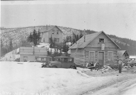 Lowhee Tailings, Hughs Store's residence in the background on the Hill. Unidentified man in photograph. 1 photograph : b&w ; 14 x 8 cm. Collection of photographs and postcards donated by Shirley Brown and Mrs. Frew (wp00341, 710-714, 747-752), photographer unknown. All photographs were taken in the Wells area, except one in Barkerville.