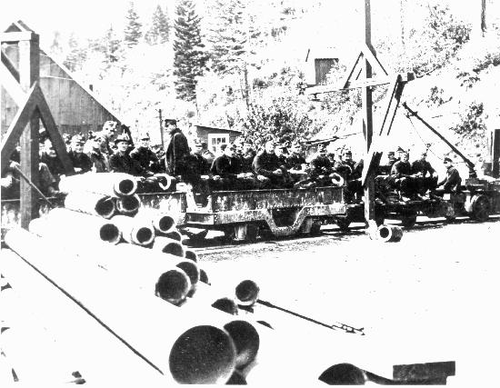 Shift going underground into the mine, Wells area. 1 photograph : b&w ; 11.5 x 9 cm. Collection of photographs and postcards donated by Shirley Brown and Mrs. Frew (wp00341, 710-714, 747-752), photographer unknown. All photographs were taken in the Wells area, except one in Barkerville.