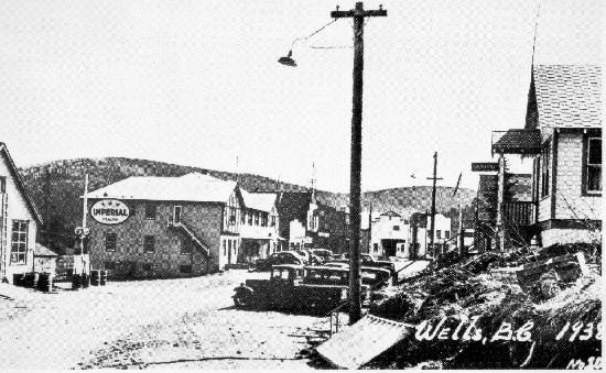Pooley Street, Wells. Buildings identified from left to right are the Gas Station (Imperial sign), Wells Hotel, Pool Hall, General Store, Good Eats Cafe and the Sunset Theatre in 1938. One postcard : b&w; 15 x 10 cm.
